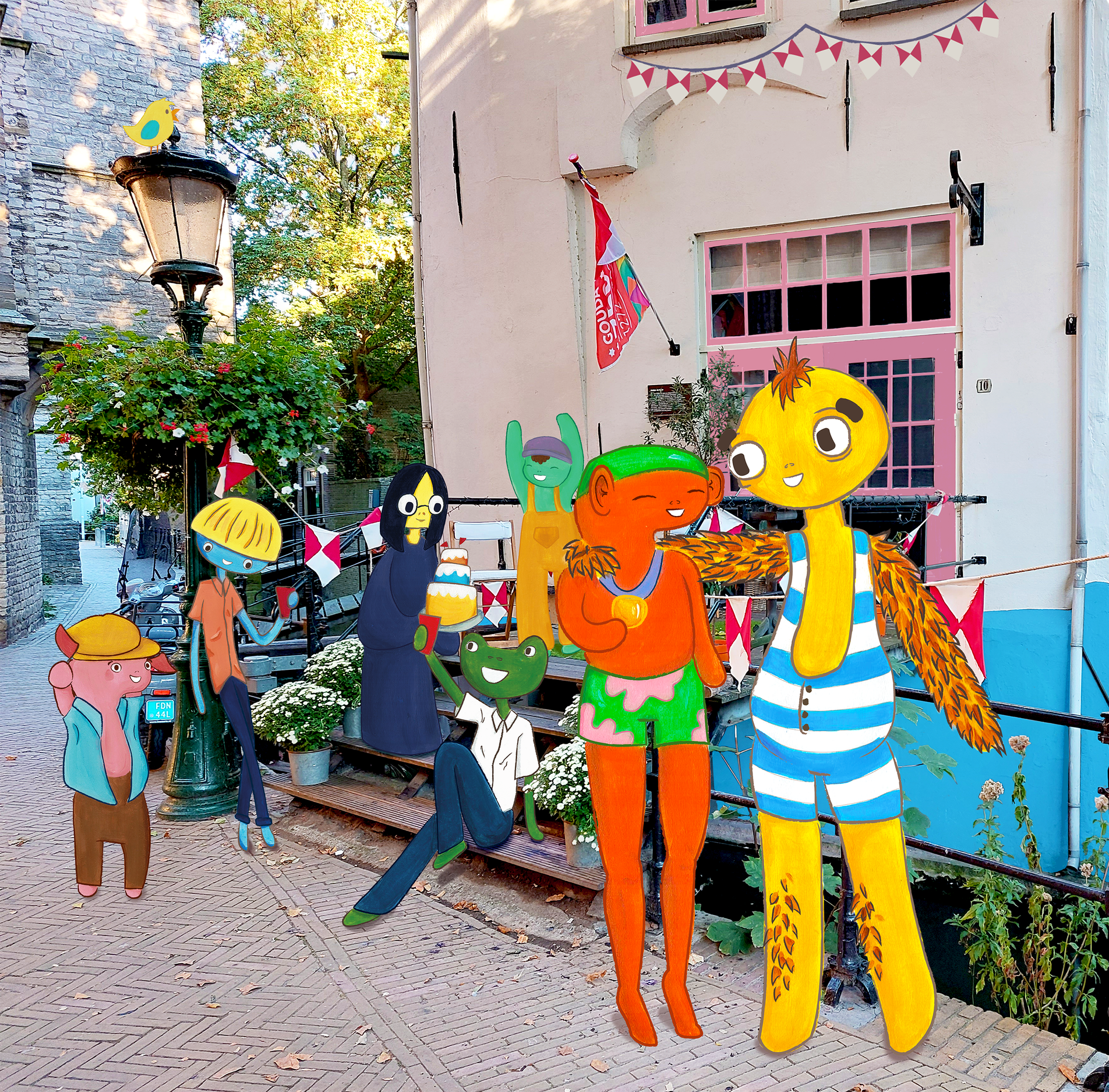 Samen met Esther Klijn heb ik het prentenboek De Rompomplop uitgebracht. Ik heb hiervoor de illustraties en deel van de vormgeving gedaan. Voor de illustraties heb ik analoge illustraties, fotografie en digitale bewerking gecombineerde. Met bewerkte foto’s van de Goudse grachten ontstaat er een kleurrijke fantasiewereld met herkenbaarheid van de stad.